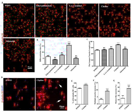 Choline was identified as the main active component of EEPC. (A) Neuro-2a cells were treated with Ethyl palmitoleate (3.8 μM), L-(-)-Arabitol (8.6 μM), Choline (34.4 μM), and Adenosine (5.4 μM) for 48 h. Scale bar, 50 mm. The differentiation rate (B) and the longest neurite length of each differentiated cell (C) were analyzed. (D) NSPCs were treated with Choline (34.4 μM), neurons were immunestained for β-tubulin III (red), and nuclei with DAPI (blue). Scale bar, 50 μm. The percentage of β-tubulin III-positive cells (E), multiple-neurite neurons (F), and mature-like neurons (G) was measured. ns, no significant differences, *** p < 0.001 compared to the DMSO.