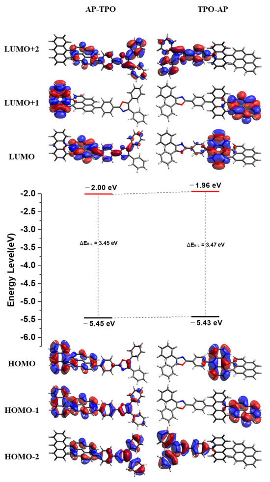Density functional theory (DFT) and time-dependent DFT (TD-DFT) calculations were performed using the B3LYP/6-311G(d) method and basis set with the ORCA program [13]. We calculated the optimized structures of the synthesized materials, as well as the energy level values at highest occupied molecular orbital (HOMO), the lowest unoccupied molecular orbital (LUMO), and the frontier orbitals using DFT (Figure 3). Furthermore, we used the TD-DFT to compute the expected absorption wavelengths, the oscillator strengths at those wavelengths, the transition states, and the contributions at each transition state for each material (Table 2). In previous studies, it was noted that in the AP-Core, the electron density distribution primarily resides in anthracene for the HOMO and LUMO, while HOMO−1 and LUMO+1 are mainly distributed in pyrene. Based on this, anthracene was denoted as the first core and pyrene as the second core. Additionally, previous studies indicated that the transition with the highest oscillator strength occurs between HOMO and LUMO at the longest wavelength [8]. However, AP-TPO and TPO-AP exhibited different trends. In the case of the AP-TPO, the electron density is evenly spread across the molecule in HOMO and HOMO−1, and in LUMO, it is predominantly distributed in pyrene and the TPO side. At the wavelength of the highest oscillator strength, 386 nm, the most significant contribution was observed in the transition from HOMO−1 to LUMO, accounting for 55%. On the other hand, the transition from HOMO to LUMO was calculated to be 21%. For the TPO-AP, in both HOMO and LUMO, the electron density is primarily present in anthracene, and in LUMO, it is partially present in the TPO. HOMO−1 and LUMO+1 mainly have electron density in pyrene, exhibiting a trend similar to previous AP-core derivatives. However, at the wavelength where the oscillator strength is the highest, 382 nm, the transition from HOMO−2 to LUMO+2, with an 83% contribution, was identified as the primary transition. The electron density of HOMO−2 and LUMO+2 in the TPO-AP is mainly distributed in the TPO moiety. Consequently, considering the major transition with a significant contribution at the wavelength with the highest oscillator strength, it can be presumed that absorption occurs predominantly in the AP-Core for the AP-TPO and in the TPO moiety for the TPO-AP. In the film state, the AP-TPO exhibited maximum absorption at 377 nm and 396 nm, while the TPO-AP exhibited maximum absorption at 332 nm and 345 nm, with trends similar to those in the solution state. However, transitioning from the solution state to the film state resulted in molecular interactions due to the close proximity of molecules, causing a red-shift and broadening of the UV-Vis and PL spectra. When compared with the solution state, the absorption wavelengths of the AP-TPO and the TPO-AP red-shifted by 6 nm and 4 nm, respectively, in the film state, and they showed a broader shape [14].