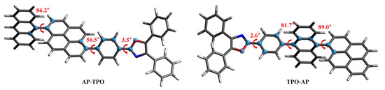 In both the solution and film states, the AP-TPO exhibited a PLQY of 82% and 20%, while the TPO-AP showed values of 88% and 24%. Generally, luminescence efficiency decreases in the film state compared to the solution state due to numerous non-radiative pathways resulting from closer intermolecular distances, which leads to quenching [16]. However, the TPO-AP demonstrated a higher PLQY compared to the AP-TPO due to the substitution of pyrene as the second core and the TPO as the side group on both sides of the anthracene, resulting in steric hindrance and a highly twisted structure. This hindered intermolecular packing and yielded a higher PLQY. These increased PLQY values are beneficial for achieving an increased EL efficiency in OLED devices. The time-resolved photoluminescence (TRPL) was used to measure fluorescence lifetime (τF) which allowed for the calculation of the radiative rate constant (kr) and the non-radiative rate constant (knr). Time decay curves of these compounds showed a mono-exponential type and a prompt fluorescence emission with no delayed fluorescence component (Figure S1) [17]. The τF values for the AP-TPO and the TPO-AP were measured as 1.26 and 1.36 ns, respectively. The AP-TPO and the TPO-AP both exhibited similar values for kr at 6.50 and 6.48 × 108/s, respectively. However, the AP-TPO had a higher knr of 14.3 × 107/s compared to the TPO-AP’s 8.83 × 107/s, resulting in a lower PLQY.