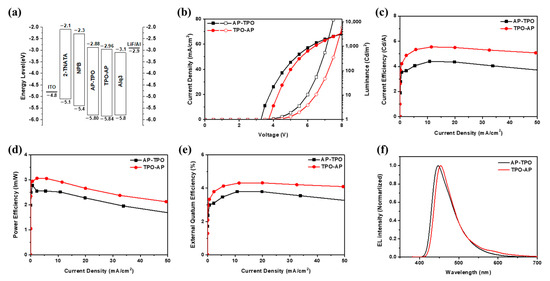 EL performances of AP-TPO and TPO-AP: (a) energy levels of the fabricated devices, (b) J-V-L curve, (c) CE curves, (d) PE curves, (e) EQE curves, and (f) EL spectra.