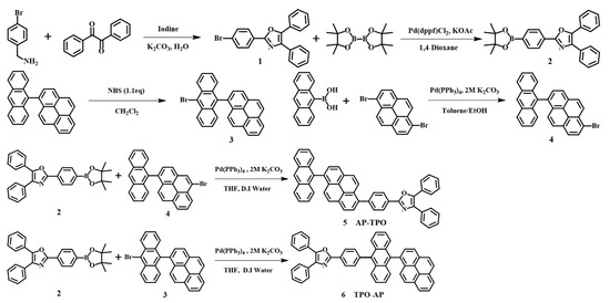 The conventional blue-emitting materials for organic light-emitting diodes (OLEDs) have primarily used single-core chromophores with an excellent photoluminescence quantum yield (PLQY), such as anthracene, pyrene, and fluorene [1,2,3]. However, these chromophores are planar, which increases the intermolecular packing in the film state and promotes excimer formation, leading to reduced electroluminescence (EL) efficiency and color purity [4,5,6]. Also, bulky side groups are typically added to the chromophore to prevent molecular interaction. However, in our study, rather than using side groups, we combined anthracene and pyrene to create a dual-core chromophore, the AP-Core chromophore, maintaining a dihedral angle of approximately 90 degrees between the two moieties. This strategy aimed to prevent excimer formation and suppress intermolecular packing, leading to the development of a new chromophore. Our approach resulted in more than twice the efficiency and device lifetime compared to materials using anthracene and pyrene as single cores [7]. Subsequent research introduced various side groups, symmetrically or asymmetrically, based on the dual core to provide blue-emitting materials [8]. However, in this study, we incorporated the same side group on each of the dual cores, anthracene and pyrene, using the 4,5-diphenyl-2-(4-(4,4,5,5-tetramethyl-1,3,2-dioxaborolan-2-yl)phenyl)oxazole (TPO) moiety. TPO possesses a weak electron-accepting characteristic that was not previously applied to the AP-Core, aiming to enhance charge balance [9,10]. This molecular design allowed for a detailed examination of the roles of the first core, anthracene, and the second core, pyrene. Finally, we synthesized two new blue-emitting materials, 2-(4-(6-(anthracen-9-yl)pyren-1-yl)phenyl)-4,5-diphenyloxazole (AP-TPO) and 4,5-diphenyl-2-(4-(10-(pyren-1-yl)anthracen-9-yl)phenyl)oxazole (TPO-AP). We also investigated the changes in the photophysical, thermal, and EL properties of the synthesized compounds (Figure 1).