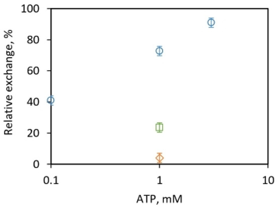 The data shown in Figure 2 yield relative rates of the Pi–ATP, ATP–HOH, and Pi–HOH exchanges of 1:6:18 at 1 mM ATP and 5 mM Mg2+ in long-time (15 min) incubations with submitochondrial particles. These are similar to the observed relative rates of the exchanges in the absence of uncouplers or pyruvate kinase addition in mitochondria [59]. However, in the short-time incubations (90 s incubations with reduced ATP turnover that ensures the maintenance of very high ATP to ADP concentrations) at otherwise the same conditions of 1 mM ATP and 5 mM Mg2+, as in Figure 2, these ratios were increased to 1:16:48 in the presence of pyruvate kinase and phosphoenolpyruvate.