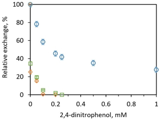 Dependence of the exchange reactions catalyzed by submitochondrial particles under the conditions given in Section 3 on the concentration of the weak anionic uncoupler of oxidative phosphorylation 2,4-dinitrophenol (mean SD, n = 6). Open gold diamonds (◇) represent the Pi–ATP exchange, open green squares (□) show the ATP–HOH exchange, while open blue circles (○) show the continued, relatively uncoupler-resistant Pi–HOH exchange.