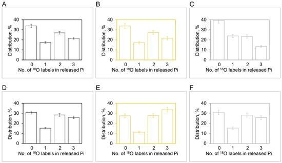 Experimental and theoretical [18O]Pi distributions during ATP hydrolysis by mitochondrial F1 at 3 µM ATP (average 18O/P = 2.10: A–C) and 5 µM ATP (average 18O/P = 1.85: D–F) based on experiments in the region of intermediate ATP concentrations (mean SD, n = 6). Experimental distributions at 3 µM ATP (A), theoretical distributions at 3 µM ATP with (B), and theoretical distributions at 3 µM ATP with (C). Experimental distributions at 5 µM ATP (D), theoretical distributions at 5 µM ATP with (E), and theoretical distributions at 5 µM ATP with (F). The initial distribution of the 18O label in the γ-phosphoryl group of ATP in our experiments measured as follows—3 18O: 57%; 2 18O: 17%; 1 18O: 2%; 0 18O: 24%.