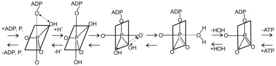 We started by considering the overall phosphorylation chemistry of oxidative and photosynthetic phosphorylation, which is summarized by the deceptively simple Equation (1). Specifically, it shows that an oxygen atom from Pi forms water, and that it is an oxygen atom that is part of the β-phosphate group of ADP that engages in a covalent P–O bond with the phosphorus atom of substrate Pi. However, as discussed above, the ATP synthase not only catalyzes the synthesis and hydrolysis of ATP (Equation (1)) but also an exchange of 18O from H18OH into the γ-phosphate P center of ATP (ATP–HOH exchange), and also into inorganic phosphate (Pi–HOH exchange). Unlike the Pi–ATP isotopic exchange that occurs at rates approximately equal to the rate of ATP synthesis, the rates of the oxygen exchanges can be rapid relative to the rate of ATP synthesis. ATP synthesis and hydrolysis, as well as the Pi–HOH and ATP–HOH exchanges, are all inhibited by oligomycin [82,83], and hence are believed to be closely related at the level of reaction mechanism. The oligomycin sensitivity suggests that these reactions occur at the same or related enzyme catalytic sites, and hence the mechanisms of the partial reactions of the oxygen exchanges will help us to gain a better understanding of the overall chemical reaction mechanism of ATP synthesis/hydrolysis. Any mechanism of ATP synthesis/hydrolysis must account for the faster Pi–HOH and ATP–HOH oxygen exchanges.