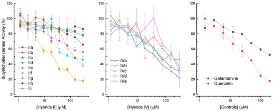 Inhibitory effects of hybrids II and IV on eqBuChE activity. Values are expressed as the mean ± sd (experiments performed in triplicate). Galantamine and quercetin served as positive controls.
