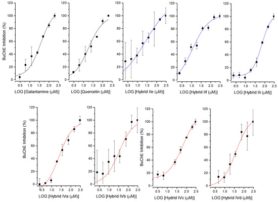 Figure 3 shows the dose–response curves for the best inhibitors, from which it was possible to determine the IC50, as displayed in Table 2. Comparing the inhibitory effect of quercetin with that of galantamine, quercetin is more potent.