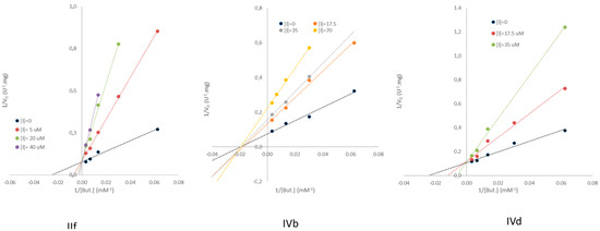 Kinetic study of the mechanism of eqBuChE inhibition by hybrids IIf, IVb, and IVd. Overlaid Lineweaver–Burk plots of the reciprocal of eqBuChEs initial velocity versus the reciprocal of substrate (BTCI) concentration, in the absence and in the presence of inhibitors (inhibitor concentrations expressed in µM).