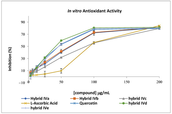 To assess the antioxidant activity of hybrids IVa–e, IIf and quercetin, the 2,2-diphenyl-1-picrylhydrazine (DPPH) radical scavenging colorimetric method was used, which is one of the most widely used methods for determining antioxidant activity. In this method, antioxidants react with DPPH (which has a strong violet color) and convert it into yellow diphenylpicrylhydrazine. Compounds were assayed in the range of concentrations from 3 to 200 μg/mL. Ascorbic acid was used as positive control. The results of % of inhibition of free radicals obtained are presented in Figure 5. At a concentration of 100 μg/mL, hybrids IVa,b, IVd–e showed greater antioxidant activity than hybrid IVb and ascorbic acid, the positive control. Hybrid IIf showed no antioxidant activity in this concentration range. We can conclude that the free hydroxyl groups of quercetin are mainly responsible for inhibiting the free radicals since, in the case of hybrid IIf, the hydroxyl groups are methylated, which did not show any antioxidant activity. Another piece of evidence is the similarity between the % inhibition values of hybrids IVa,b and IVd,e and quercetin. In conclusion, the functionalization of quercetin with the 1,2,3-triazole unit did not affect its antioxidant activity, which means that the new quercetin hybrids also have strong antioxidant activity.