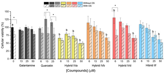 Effect of different concentrations of hybrids IVa, IVb, IVd, IIf, galantamine, and quercetin on cell viability in the presence and absence of an oxidative stressor (OS) (H2O2). MCF-7 cells were incubated with different concentrations of compounds (6, 13, 25, and 50 μM) for 72 h. The cell viability was measured using the WST-1 assay. Data are presented as means ± SD (* significant for p < 0.05).