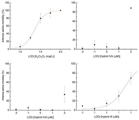 Artemia salina was used for in vivo general toxicity assessment of the promising hybrids IVb, IVd, and IIf; the results are shown in Table 4 and Figure 7. K2Cr2O7 was used as a control. Hybrid IVd presented the lowest toxicity. Hybrids IVb and IIf did not present toxicity in concentrations ≤10 μM.