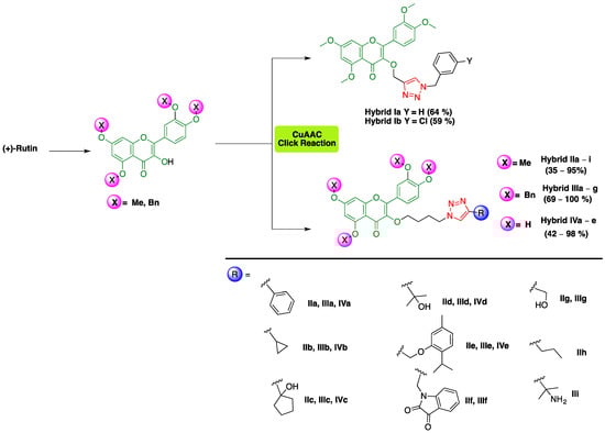 The quercetin-1,2,3-triazole hybrids I–IV developed by our group in 2022 were prepared by functionalizing the 3-OH of quercetin with a short alkyl chain and then with a 1,2,3-triazole moiety through copper-catalyzed azide-alkyne cycloaddition (CuAAC), the “click” reaction. Four types of hybrid were prepared, the difference between them being the protection of the remaining hydroxyl groups of quercetin with a methyl group (in this case hybrids I and II) or a benzyl group (hybrids III). Hybrids IV have the hydroxyl groups of quercetin free, and were prepared via the debenzylation of hybrids III [26]. The protection of the hydroxyl groups can make the hybrids more permeable to membranes [27]. These interesting hybrids were previously prepared and fully characterized, and their antiproliferative activity was evaluated on the REM-138 cell line (canine breast cancer) [26]. The most active hybrids exhibited extraordinary IC50 values, with the lowest value of only 41 nM. These chemical modifications in the structure of the quercetin moiety were crucial to increasing the antiproliferative activity in the cancer cell line. The synthetic route used is shown in Scheme 1.