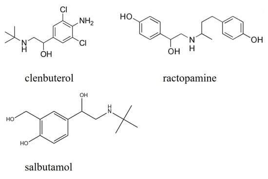 LMP mainly includes drugs such as clenbuterol, ractopamine, salbutamol, cimaterol, clorprenaline, terbutaline, tulobuterol, penbutolol, brombuterol, and their salts and lipids [41]. The most used feed additives are clenbuterol, ractopamine, and salbutamol and their salts and lipids.