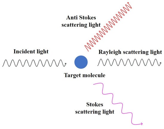 As shown in Figure 2, when monochromatic light is irradiated onto a molecule to be measured, a part of the incident light will be absorbed, a part of it will be reflected, and a part of it will be scattered by the action of the molecule [44,45]. Scattered light is further divided into elastic and inelastic scattering [46]. Most of the scattered light coincides with the frequency of the incident light, and this scattered light is known as elastic or Rayleigh scattering [47,48]. A very small fraction (about 1/107 of the scattered light) of the excitation light changes in energy and frequency upon collision with a molecule, which is called inelastic scattering. In inelastic scattering, the vast majority of the energy is diminished, i.e., the frequency of the incident light decreases, and this portion of the light is known as Stokes Raman scattering [49]. A very small portion of the incident light increases in energy, i.e., the frequency of the incident light increases, and this portion of the light is known as anti-Stokes Raman scattering. Stokes Raman scattering is usually measured because it is much more numerous and easier to measure than anti-Stokes Raman scattering. The absolute value of the decrease in the frequency of the incident light is expressed as a Raman shift. The magnitude of the Raman shift is only related to the structure of the molecule itself and is not affected by the frequency of the incident light [50].