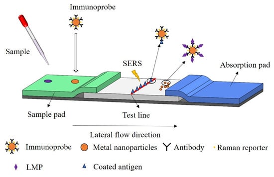 Immuno–chromatography (ICA) is a membrane-based detection technique based on antigen–antibody interactions, which allows for the separation of reactive products from unreacted products without the need for additional precipitation or washing steps [105]. The specificity and sensitivity for detecting LMP in meat can be improved using the SERS in combination with the ICA. The schematic diagram of the process of detecting LMP by SERS–ICA is shown in Figure 4. First, the immunoprobes are prepared using metal nanoparticles, antibodies against LMP, and Raman reporters. Next, the sample to be measured and the immunoprobe are added dropwise to the sample pad of the immunoprobe paper, moving together to the right under the action of the absorption pad. LMP molecules in the samples will produce an immunoreaction with the immunoprobe. Probes not involved in the reaction are immobilized at the test line by being captured by the encapsulated antigen. The nanoprobes involved in the reaction continue to move to the right. Finally, the SERS spectra of the Raman reporter molecules on the test line are measured, resulting in an indirect prediction of LMP concentration. The concentration of LMP is inversely proportional to the intensity of the characteristic SERS peak.
