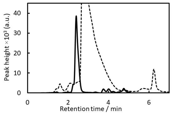 As described in a previous study [24], a calibration curve was constructed from the peak heights of the chromatograms of the first and second extractions, and %E was calculated from the slope of the curve. If the slope at 100% recovery is α, %E can be obtained from the slopes of the calibration curves of the first and second extractions. The calibration curves for BPA from the IALP (EHOPA+/DS−) extraction (first extraction) and the calibration curve obtained by extracting its aqueous phase again with IALP (second extraction) are shown in Figure S1.