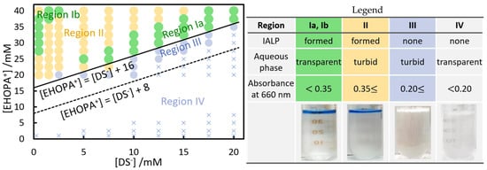In Region I (Figure 2), an IALP was formed at the top and the aqueous phase was clear (absorbance at 660 nm was less than 0.35). In Region II, an IALP was also formed, but the aqueous phase was cloudy (absorbance at 660 nm was greater than 0.35). In Region III, the aqueous phase was cloudy (absorbance at 660 nm was greater than 0.35), but no IALP was formed. In Region IV, the aqueous phase was clear (absorbance at 660 nm was less than 0.15). The IALP formed from Ben+Cl− and EBS− had a single Region I [24], while for the EHOPA+/DS− combination, Region I was divided into two Regions, Ia and Ib (Figure 2). The volume of the IALP formed in Region Ib was smaller than that in Region Ia. The equations are: