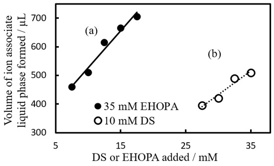 As seen in Figure 3, the effect of the organic anions on the volume of the IALP formed was approximately 1.5 times greater than that of the organic cations. The volume of the IALP was more influenced by the concentration of DS− than by the concentration of EHOPA+.