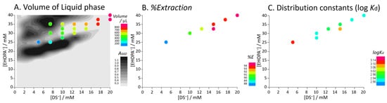 Figure 4 shows the volume of the IALP formed, %E of BPA, and the partition constant for each concentration. The absorbance (turbidity) at 660 nm is shown in a grayscale contour plot (Figure 4A). As the concentration of EHOPA or DS increased, IAs were formed, resulting in a cloudy sample. Further increasing the concentration resulted in the formation of a liquid phase which became transparent in the appropriate concentration range, while IAs were colloidally dispersed and become cloudy in other regions. As shown in Figure 4A, the volume of the liquid phase increased upon increasing the concentrations of EHOPA and DS.