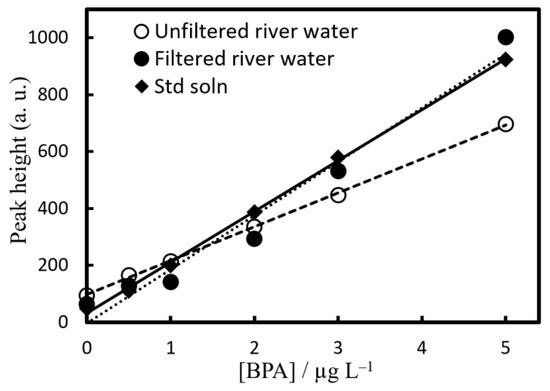 Calibration curves of BPA in pure water (◆) and river water sample (○,●). Concentration of BPA was 0–5 µg L−1. Experimental conditions: [EHOPA+] = 25 × 10−3 mol L−1, [DS−] = 5 × 10−3 mol L−1, pH = 1.9. (○) Nonfiltered water and (●) filtered water.