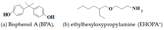 The tris[2-(2-methoxyethoxy)ethyl]amine [organic cation] solution (1 M) was prepared by dissolving tris[2-(2-methoxyethoxy)ethyl]amine (Tokyo Chemical Industry, Tokyo, Japan) (32 g) in water (100 mL). The 3-butoxypropylamine [organic cation] solution (0.5 M) was obtained by dissolving 3-butoxypropylamine (6.6 g, Tokyo Chemical Industry, Japan) in water (100 mL). The EHOPA+Cl− solution was prepared by dissolving ethylhexyloxypropylamine (18.7 g, Tokyo Chemical Industry, Japan) with a HCl solution (2 M, 100 mL). The sodium dodecyl sulfate [organic anion] solution (0.1 M) was prepared by dissolving sodium lauryl sulfate (2.9 g, specially prepared reagent for biochemical research, Nacalai Tesque Inc., Kyoto, Japan, purity ≥ 99.5% (as C12, GC)) in water (100 mL). A standard BPA solution (100 mg L−1) was prepared by dissolving BPA (10 mg, Wako Pure Chemical, Osaka, Japan) in acetonitrile (100 mL). The HCl solution (2 M) was prepared by mixing HCl and water at a volume ratio of 1:5. The tetramethylammonium hydroxide (5%, TMAH) aqueous solution was prepared by diluting TAMAPURE AA100 TMAH (10 mL, 25 %, Tama Chemical, Kawasaki, Japan) up to 50 mL using water. The TMAH ethanol solution (5%) was prepared by diluting TAMAPURE AA100 TMAH (10 mL, 25%) to 50 mL using ethanol. Figure 6 shows the structure of BPA and the cation source, EHOPA.