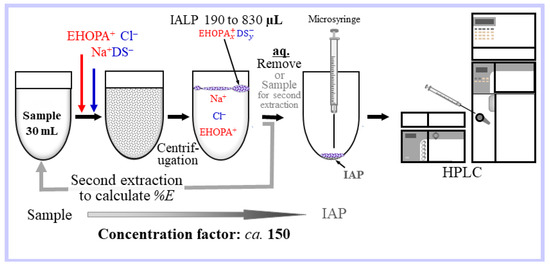 The water sample (40 mL) along with EHOPA+ HCl (1 M) and Na+DS− (0.1 M) solutions were centrifuged for 30 min to separate the IA liquid and aqueous phases. The aqueous phase was then removed. After centrifugation for 1 min to remove the water droplets adhering to the vessel wall, the IALP was directly collected and measured by HPLC-FLD or HPLC-ECD).