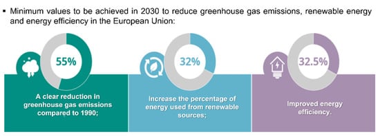 In a space of one hundred years, the world’s population has increased more than four times, and in 2066, it is estimated that it will reach 10.43 billion people [1]. The abrupt population growth that has been observed in recent years derives from the improvement in the quality of life and in health and hygiene systems, which logically drastically reduces the number of deaths and is translated into population growth. However, the increase in the world population has several negative impacts on the planet, in which climate change, decreased food security, loss of biodiversity, destruction of ecosystems and overexploitation of the planet’s natural resources are the most visible ones [2]. The main cause of climate change is the emission of greenhouse gases, which retain solar radiation inside the planet, preventing its release into space and consequently contributing to global warming [3,4]. Between 2011 and 2020, the recorded global temperature of the Earth’s surface was 1.1 °C above the values registered between 1850 and 1900 [2,5]; in addition, the summer of 2022 was one of the hottest in Europe so far [5]. This increase in temperature is alarming, affecting the health and well-being of living beings and exposing the planet to a greater risk of catastrophic events. Global actions should be undertaken to be able to achieve a 55% reduction in greenhouse gas emissions by 2030 when compared with 1990 (Figure 1) [5]. Thus, to protect our planet, humankind must make changes in its way of life, ranging from quite simple changes in our daily lives to major changes at the industrial level. For this change, sustainable development, a circular economy, responsible consumption and the use of renewable energies are key points.