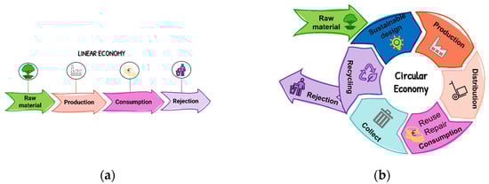In this sense, the European Union has made efforts to reduce greenhouse gas emissions and, in 2015, the “Neutral climate now” plan was launched by the UNFCCC (United nations framework convention on climate change), which challenges all parts of the world to apply measures to achieve the same global goal: climate neutrality by 2050. The concept of climate neutrality implies that global greenhouse gas emissions will be reduced [3]. This must be a commitment made by us, as individuals, as society, by the governments and by all the industries. In addition, the European Environment Agency (EEA) demanded the exploration of new alternative paths that would allow the transition from a linear economy to a circular economy. A linear economy involves obtaining and processing raw materials that are then consumed in a short period of time and discarded as waste shortly after its use [6]. Alternatively, a circular economy encourages the recovery of waste by reusing, valuing, reintroducing and redistributing materials in the supply chain, which allows the lifespan of the products to be extended (Figure 2). The circular economy allows for economic growth based on the management of global resources, avoiding the production and use of novel resources and recycling the existing ones, generating in this way less waste, which consequently reduces the negative environmental impacts caused by them [6].