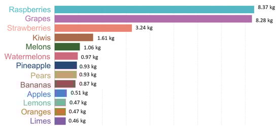 Fruits and vegetables are the most consumed foods worldwide and, consequently, the largest producers of waste. Grapes are one of the main producers of greenhouse gases, as shown in Figure 5 [6], with 8.28 kg of CO2 equivalents emitted for each kilogram of grapes produced in 2022 [9].