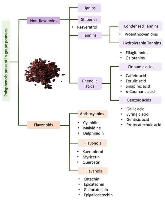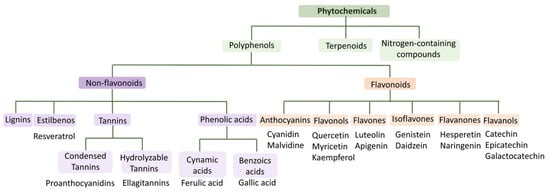 Positive effects on human health have been recognized from most products that are derived from grapes, due to the abundance of bioactive compounds that are present in their composition [38]. Bioactive compounds are secondary metabolites that are present in plants, such as fruits, vegetables and cereals, microorganisms and animals, and have the capacity to cause pharmacological or toxicological effects in humans and animals [39,40,41]. These compounds are classified into phenolic compounds (polyphenols), terpenoids and nitrogen-containing compounds (Figure 6). Phenolic compounds are the largest group of phytochemicals and are present in almost all plants in the form of secondary metabolites, where they play a key role both in growth and reproduction processes, as well as in the protection against pathogens and predators [42,43,44]. Regarding their chemical structure, polyphenols have one or more aromatic rings to which one or more hydroxyl groups are attached, so their structures can range from simple molecules, such as phenolic acids, to highly polymerized compounds, such as tannins [41,42,43,44]. Phenolic compounds can be further divided into flavonoids (anthocyanins, flavonols, flavones, isoflavones, flavanones and flavanols) and non-flavonoids (phenolic acids, stilbenes, lignins and tannins), as can be seen in Figure 6 [45].