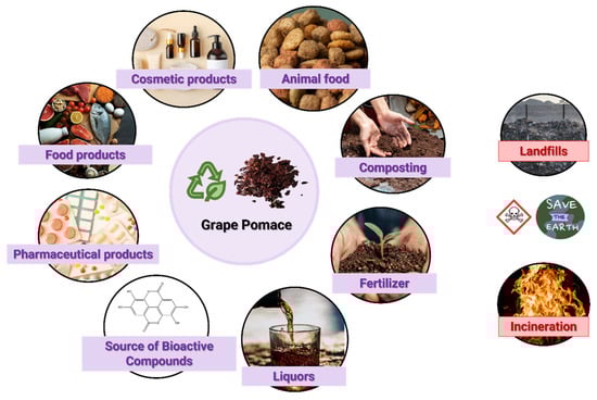 Several applications have already been developed for the recovery of waste and by-products from the winery industry (Figure 8), but, in general, they are not economically viable, as they require substantial amounts of resources and energy for their correct management. The most used disposal methods for grape pomace are landfilling, incineration and composting. In addition to these, a small percentage is used in distillation processes, to produce liquors, fertilizers or animal feed. Several industries also try to produce pasta and flour from this by-product. However, there are drawbacks to the current solutions since grape pomace contains anti-nutritive and antimicrobial compounds that can negatively affect plant cultures and the digestion process of animals [21,24,32,69]. One could think of incinerating or disposing these residues in the soil; however, the phenolic compounds give the bagasse an acidic pH that makes the soil more resistant to biological degradation. Furthermore, improper disposal leads to the contamination of groundwater and surface water [69]. Thus, there are still challenges, both economic and environmental, to achieve a circular economy within the wine industry [69].