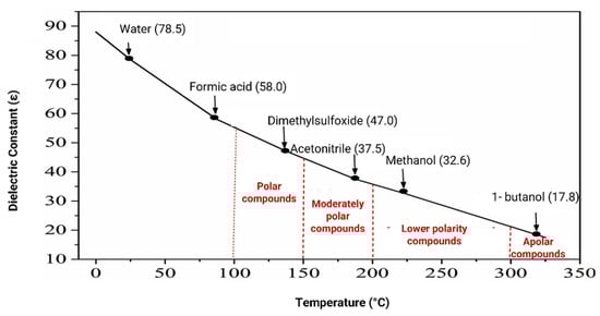 When temperature and pressure are increased, significant changes occur in the physical and chemical properties of water, namely an increase in diffusivity and a constant decrease in its viscosity, surface tension and dielectric constant, with the latter resulting from the weakening of hydrogen bonds [78,79,80,81,84]. All these changes in the physical and chemical properties of water allow this type of extraction to be more efficient than commonly used techniques, due to the faster mass transfer, as well as the better impregnation of the extraction solvent in the plant matrix [84]. At 25 °C and atmospheric pressure, the dielectric constant of water is 80 [76]. If the temperature is increased to, for example, 250 °C and the pressure is increased to 25 bar, the dielectric constant drastically decreases to 25, being in the range of the dielectric constants of organic solvents, at room temperature (Figure 9). Thus, at these temperatures and pressures, water becomes capable of extracting compounds of medium to low polarity, similarly to organic solvents [73,75,76,77,80,81,82].