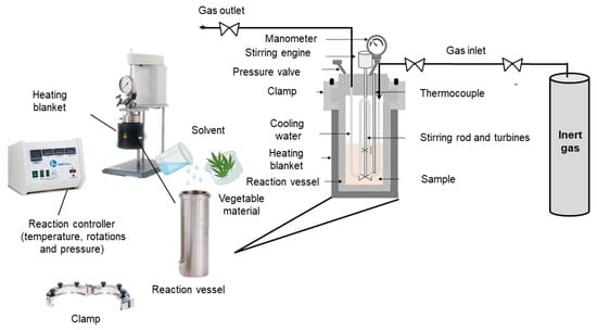 Figure 10 shows a schematic of a subcritical water extractor. The equipment consists of the reaction vessel, to which the solvent and the plant sample are added, which is placed inside a heating mantle and closed with the help of a clamp. The reaction vessel also contains cooling water inside, the stirrer rod and turbines to ensure the stirring of the mixture. The reaction controller allows parameters to be regulated, such as temperature, pressure and rotations. In addition, an inert gas, usually nitrogen, can also be used to maintain an inert atmosphere [79,80,85].