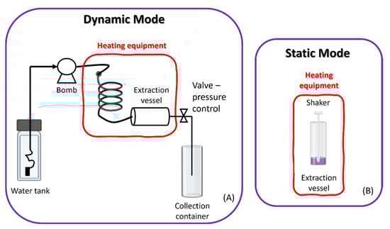 There are two types of equipment (Figure 11), static (discrete mode) and dynamic (continuous flow), which can be used individually or together. In the static extraction process, the raw material is moistened with water at room temperature, and only then is it subjected to high pressures and temperatures. The prolonged exposure time to elevated temperatures can cause degradation of the thermolabile compounds to be extracted, which is a disadvantage. The dynamic extraction process is a continuous process, which consists of introducing the raw material into the extraction vessel, which is continuously supplied with heated water, with the help of a pump. This mode allows the extraction efficiency to be increased as it increases the mass transfer and decreases the extraction time. However, the final extract may have to undergo a concentration step. Thus, an extraction in the static-dynamic mode can also be performed, through which more concentrated extracts are obtained with a shorter extraction time [85,86,87].