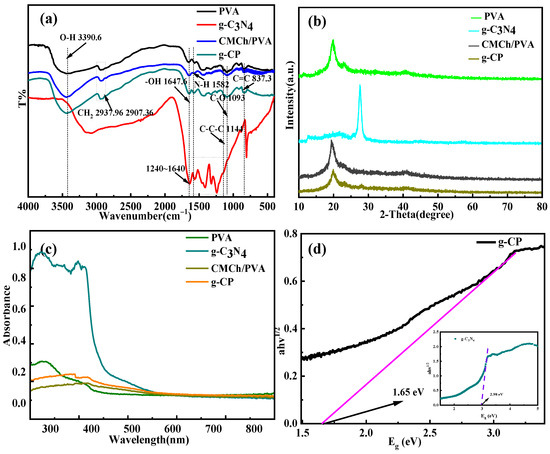 The FTIR spectra of Figure 1a showed the presence of functional groups of the prepared materials. In the spectra of PVA, the absorption peaks of 3390.6 cm−1, 2937.96 cm−1, 2907.36 cm−1, 1420.04 cm−1, and 1086.63 cm−1 were respectively attributed to the -OH (νOH-PVA), -CH2 (νasCH2 PVA), -CH2 (νsCH2 PVA), -CH2 (δCH2 PVA), and -C-O (νC-O PVA). The absorption peak at 1647.6 cm−1 corresponded to the superposition of the C=C stretching vibration and the hydroxyl group deformation vibration peaks in RHC=CH2. The absorption peak at 1144 cm−1 was contributed by the C-C-C stretching vibration of PVA. The absorption peak at 837.3 cm−1 corresponded to the C=C stretching vibration at the end of the vinyl [29]. The absorption peaks at 1582 cm−1, 1409 cm−1, 1310 cm−1, and 1053 cm−1 corresponded to the symmetric stretching vibration and asymmetric stretching vibration of the carboxymethyl of CMCh, and the stretching vibration of C-N and C-O bonds, respectively [30]. In the spectrum of g-C3N4, the absorption peak at 810 cm−1 corresponded to the out-of-plane bending mode of heterocyclic C-N, and the stretching vibrational peaks of aromatic C-N were at 1200–1600 cm−1 [31]. The spectrum of g-CP contained the characteristic functional groups of chitosan and carbon nitride.