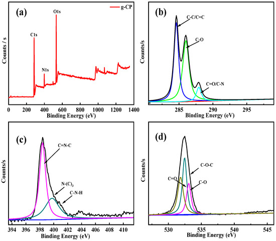 (a–d) XPS full spectrum, and C1s, N1s, and O1s spectra of 2wt% g-CP, respectively.
