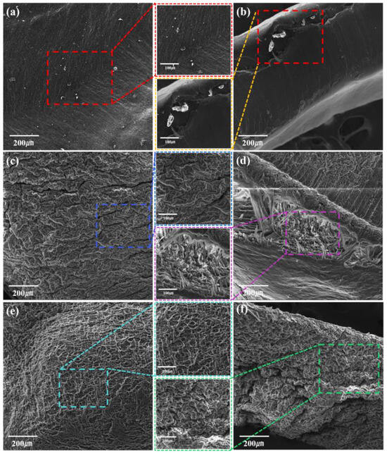 The front and cross-sections of PVA, CMCh/PVA, and 2 wt% g-CP hydrogels were characterized using scanning electron microscopy. As could be seen from Figure 3a–f, the cross-sectional images of the g-CP showed more continuous porous structures compared to the monolithic and binary hydrogels. It was proved that the addition of g-C3N4 made the hydrogel have a more compact network structure and a higher degree of cross-linking. There might be three main reasons for the denser network of g-CP: firstly, the addition of g-C3N4 could increase the quantity of crosslinking points, thus forming a greater number of crosslinked networks; secondly, g-C3N4 had high hardness and strength, which could be used as a reinforcing agent to strengthen the skeleton structure of the hydrogel; thirdly, powder could effectively fill the pores within the hydrogel, and this physical blocking effect would result in a more compact crosslinked network, reducing the porosity of the material. These would potentially shorten the molecular transport channel and greatly enhance the molecular adsorption kinetics of RhB.