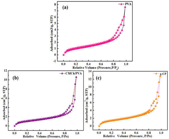 Nitrogen adsorption–desorption isotherms of PVA (a), CMCh/PVA (b), 2 wt% g-CP (c) hydrogels.
