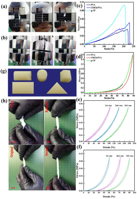 Mechanical properties are one of the basic properties of engineering hydrogels. The mechanical properties of PVA, CMCh/PVA, and 2 wt% g-CP hydrogels were tested using an electronic universal testing machine (QJ-210, Shanghai Qingji Instrument Technology, Shanghai, China). Figure 6a–d showed that the tensile and compressive moduli of PVA, CMCh/PVA, and 2 wt% g-CP hydrogels were 0.033 MPa, 0.0424 MPa, and 0.093 MPa and 0.357 MPa, 1.58 MPa, and 1.61 MPa, respectively. g-CP had better tensile and compressive moduli than the mono and binary hydrogels. Figure 6e,f showed the cyclic stretching and cyclic compression experiments. The hysteresis curves tended to be stable through tensile and cyclic experiments, which indicated that g-CP had good resilience.