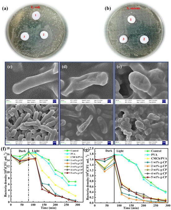 Zone of inhibition and photocatalytic antibacterial tests. Inhibition of E. coli and S. aureus by different hydrogels under dark conditions in pictures (1: PVA, 2: CMCh/PVA, 3: g-CP), respectively (a,b); SEM images of g-CP against E. coli at 1 h, 2 h, and 12 h, respectively (c–e); the PVA, CMCh/PVA, and different amounts of g-CP hydrogels on the photocatalytic antibacterial performance of E. coli and S. aureus (f,g).