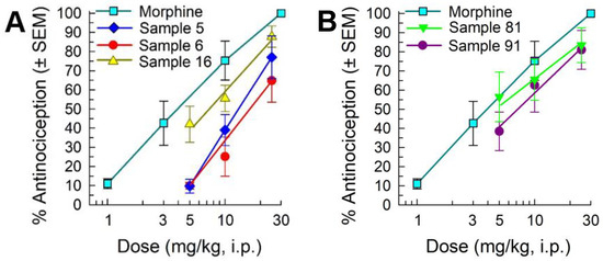 Antinociception produced by the top five mixture-based samples in the mouse 55 °C warm water tail-withdrawal assay is dose-dependent. (A) Dose–response of mixture-based samples 5, 6 and 16 defined at the R2 position, 60 min after administration; (B) Dose–response of mixture-based samples 81 and 91 defined at the R5 position, 120 min after administration. All samples were administered by the i.p. route. Morphine is included as a positive control, with antinociception measured at the 30 min peak effect. All points = 8 mice (7–11 mice for morphine).