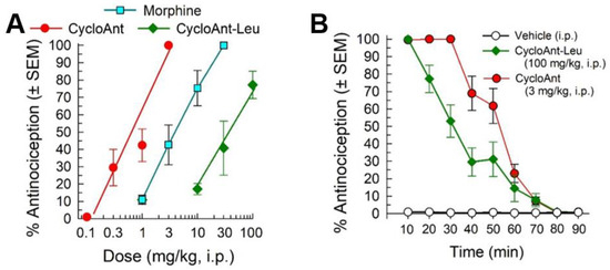 Acute antinociceptive activity in the 55 °C WWTW assay following i.p. administration in C57BL/6J mice. Shown as (A) dose–response and (B) time-course of antinociception following a maximally efficacious dose of CycloAnt or CycloAnt-Leu. Morphine and vehicle are included as controls where appropriate. Points represent average % Antinociception ± SEM of 6–11 mice for each compound presented.