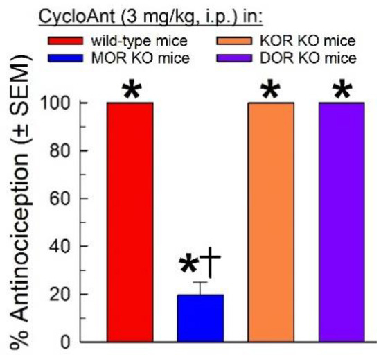 Evaluation of opioid receptor involvement in the antinociceptive activity of CycloAnt (3 mg/kg, i.p.) 20 min after administration to wild-type (C57BL/6 J) or mice where individual opioid receptors have been knocked out. * Significantly different from vehicle-control response (p < 0.05); † Significantly different from wild-type mice response (p < 0.0001); one-way ANOVA with Dunnett’s post hoc test. Bars each represent average % Antinociception ± SEM of 8 mice.
