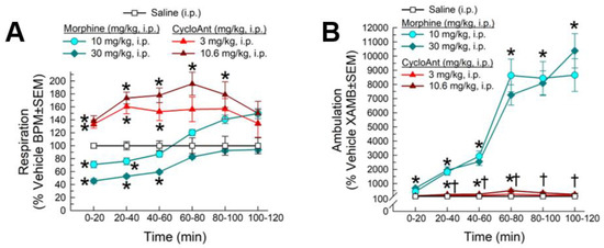 Effects of the hit on (A) respiration and (B) ambulation in C57BL/6J mice tested in the CLAMS/Oxymax system. Respiratory and ambulation were monitored after i.p. administration of vehicle (saline, i.p.), morphine (10 or 30 mg/kg, i.p.), or CycloAnt (3 or 10.6 mg/kg, i.p.). Data from 12-20 mice presented as % vehicle ± SEM; breaths per minute, BPM (A) or ambulation, XAMB (B). Dashed lines represent normalized vehicle response. * Significantly different from vehicle control response (p < 0.05); † Significantly different from response of morphine at either dose (p < 0.05); two-way RM ANOVA with Tukey’s multiple comparison post hoc test.