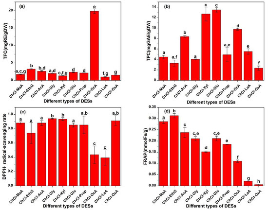(a) TFC, (b) TPC, (c) DPPH, and (d) FRAP of different DES extracts. Different small letters on the top of bars represent significant statistical difference (p < 0.05).