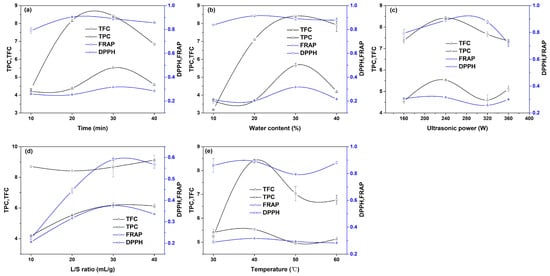 Single-factor experimental results: (a) ultrasonic time, (b) water content in DES, (c) ultrasonic power, (d) solid–liquid ratio, and (e) extraction temperature.