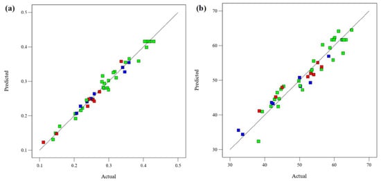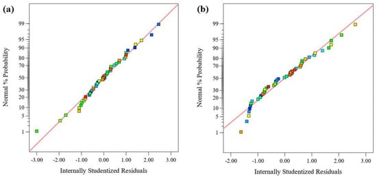 The relationship between the experimental and the model’s predicted responses (FRAP and DPPH) is shown in Figure 3. Most of the data points in the figure closely fit the straight lines, indicating that the models can well explain the experimental results. The normal probability plot of the residuals is used to diagnose and prove errors from the assumptions and predictions of the model. The errors with the homogeneous variance normal distribution are not correlated with each other. The residual is defined as the difference between the observed and predicted values in a regression analysis. Figure 4 shows the normal probability diagram of the residuals of the models. There are negligible violations of the assumptions made. This satisfactory residual normal graph confirms the assumption of the models and the independence of the residuals.
