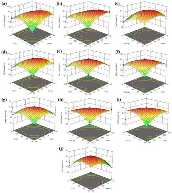 The 3D surface response maps of (a) AB, (b) AC, (c) AD, (d) AE, (e) BC, (f) BD, (g) BE, (h) CD, (i) CE, and (j) DE to FRAP.