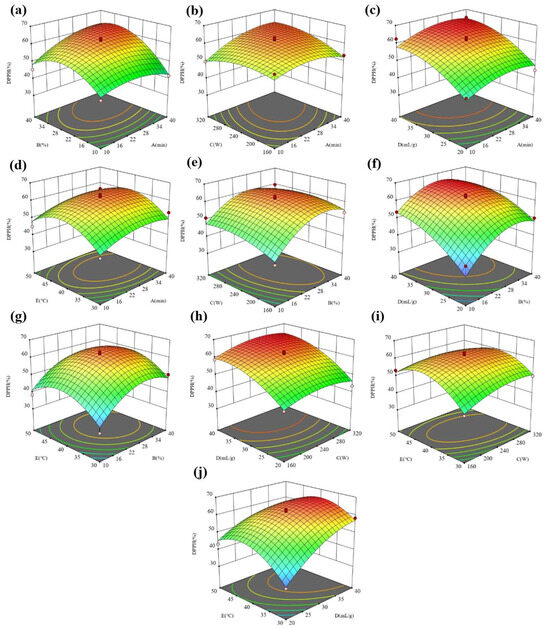 The 3D surface response maps of (a) AB, (b) AC, (c) AD, (d) AE, (e) BC, (f) BD, (g) BE, (h) CD, (i) CE, and (j) DE to DPPH.
