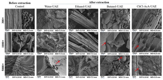 Figure 7 shows the effects of different solvents on the surface structure of Perilla leaf cells after UAE based on water, ethanol, butanol, and ChCl-AcA. Compared with freeze-dried Perilla leaves without solvent treatment, significant changes in the surface morphology of cells were observed. Before extraction, the surface of the leaves was relatively flat. After being treated with the above solvents, some holes and cracks appeared on the surface of the leaf cells. In particular, Perilla leaves treated with water and ChCl-AcA showed more holes and cracks. The ethanol-treated leaves showed no significant difference compared with the control group. Many researchers have reported that destroying cells can release more active compounds from the plant matrix [26,27]. ChCl-AcA can act as an effective solvent for breaking down the cell wall; thus, more antioxidants are released from the cells. This study is consistent with the results reported by de Almeida Pontes et al. that a DES can extract more phenolic compounds from olive leaves by damaging the cell structure [11].